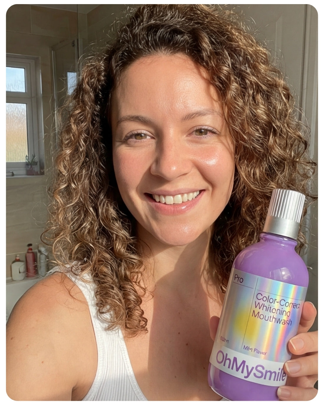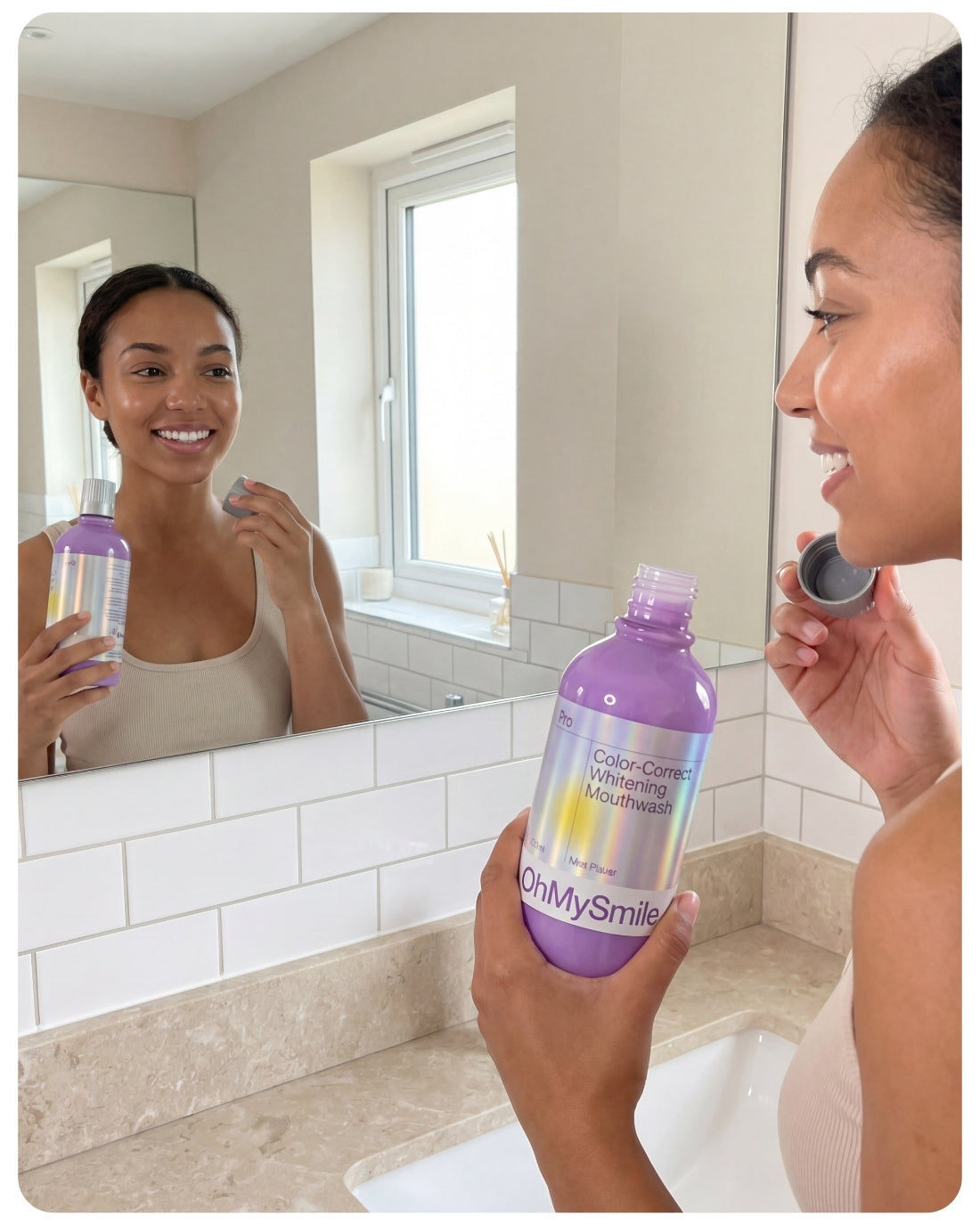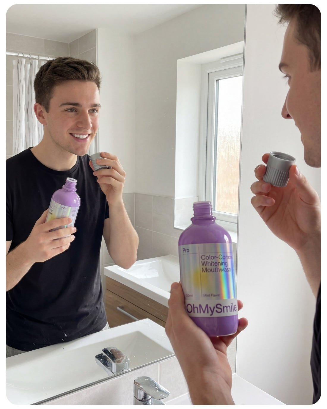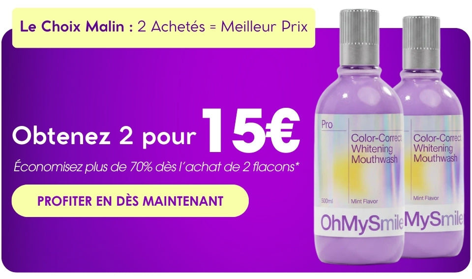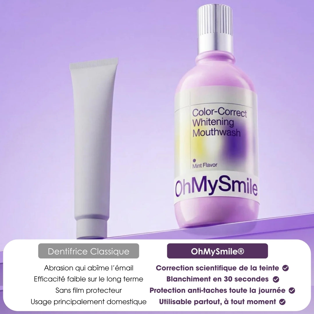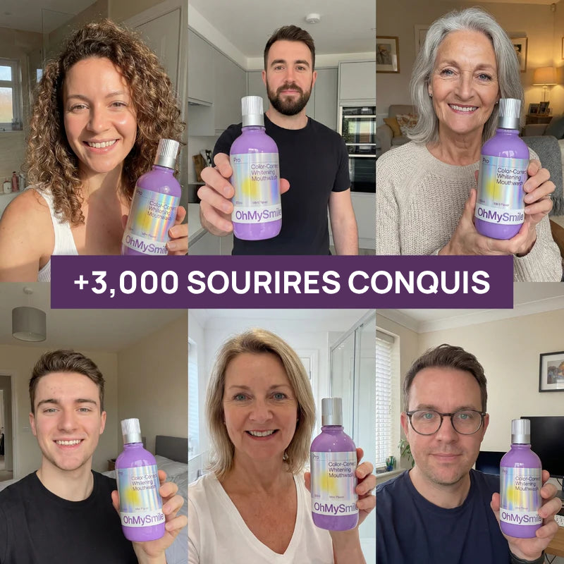OhMySmile® révolutionne votre routine avec son effet violet correcteur instantané. Ce bain de bouche quotidien neutralise les tons jaunes dès la première utilisation, sans agresser votre émail.