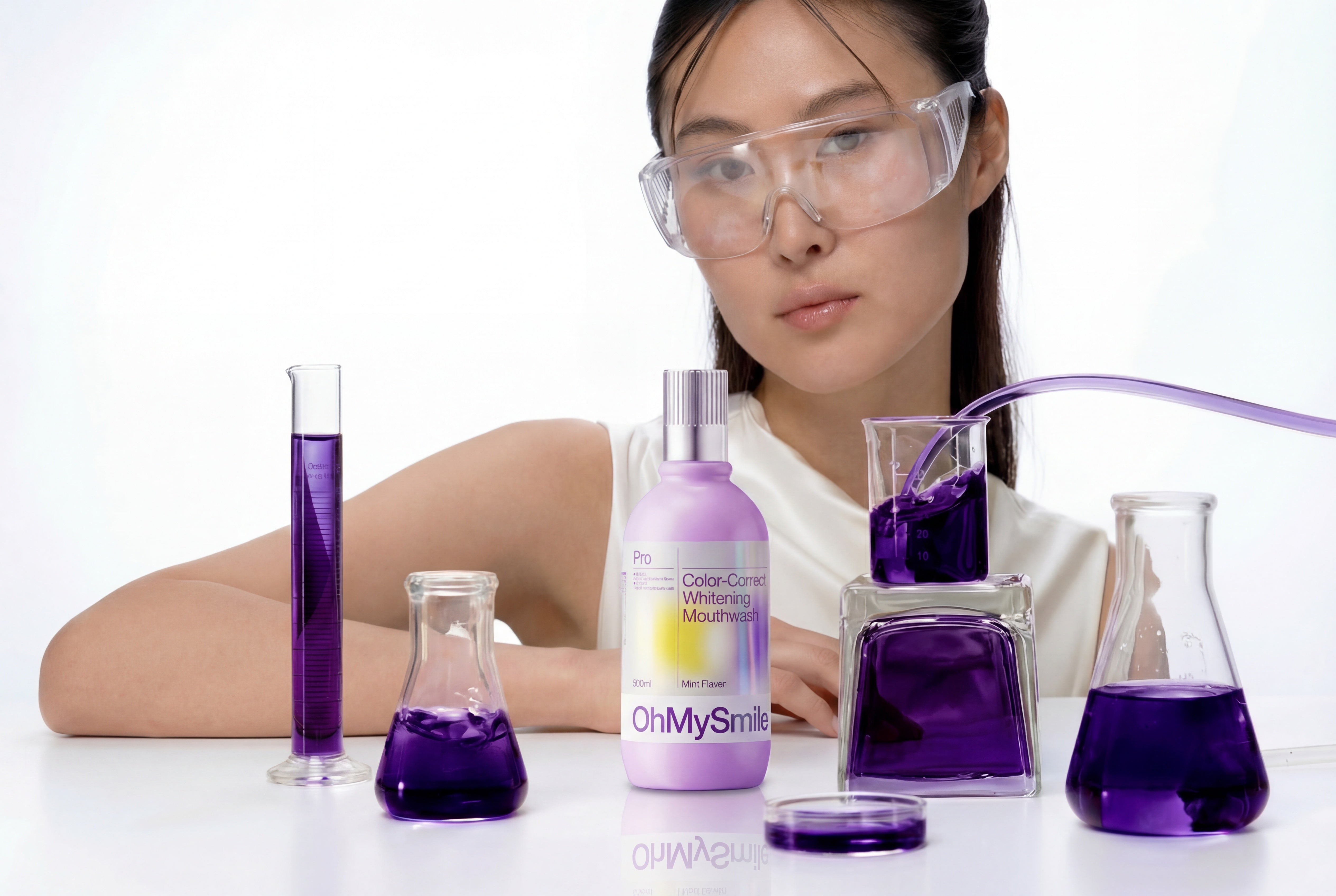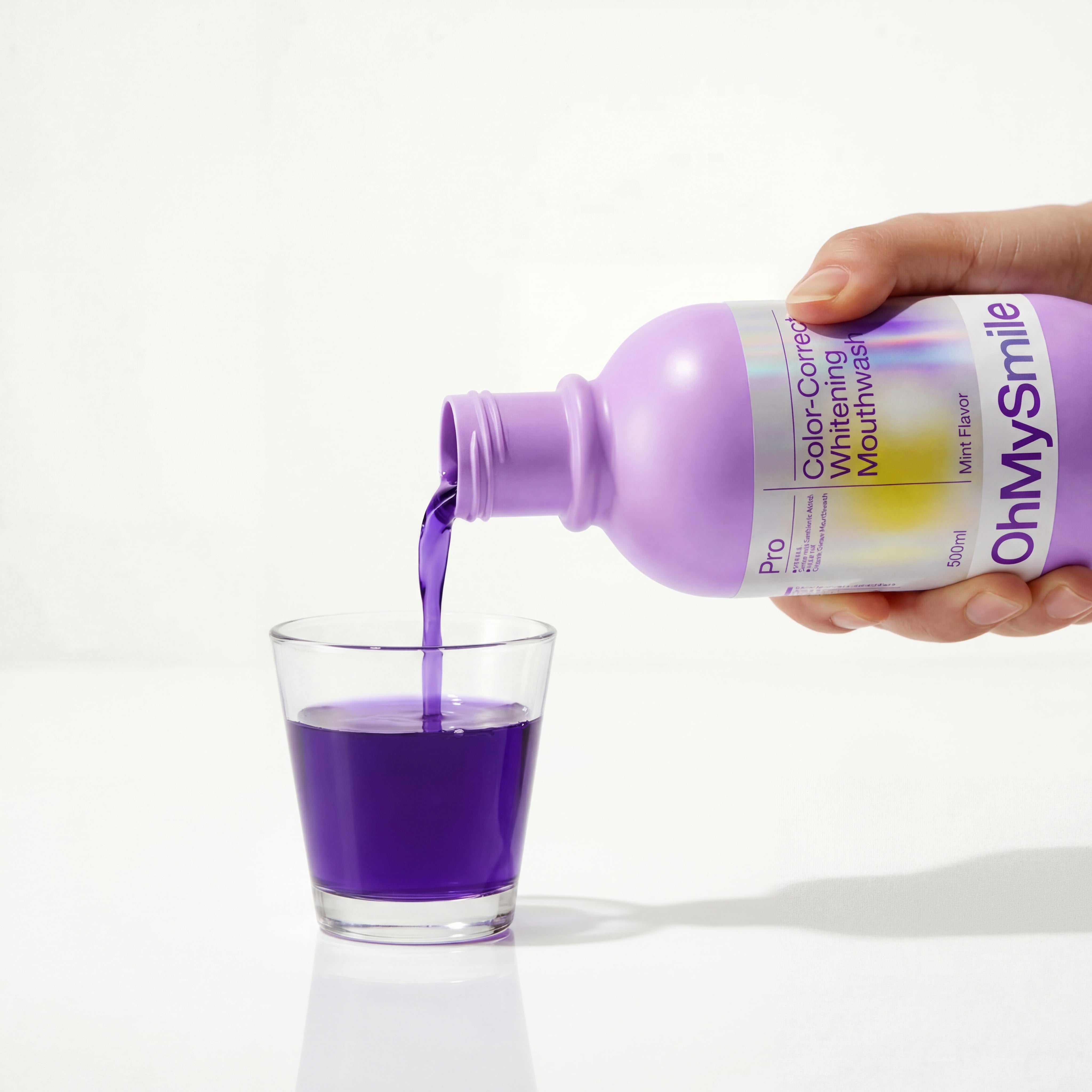 OhMySmile® révolutionne votre routine avec son effet violet correcteur instantané. Ce bain de bouche quotidien neutralise les tons jaunes dès la première utilisation, sans agresser votre émail.
